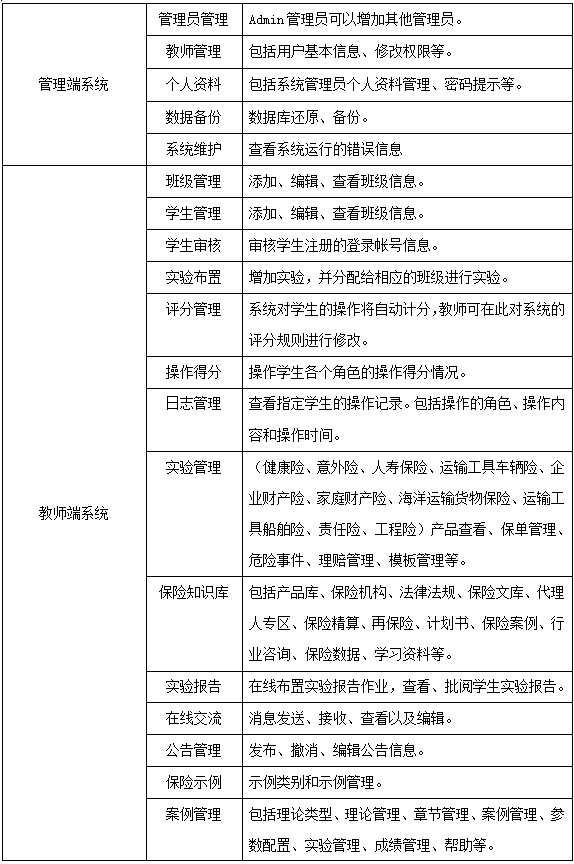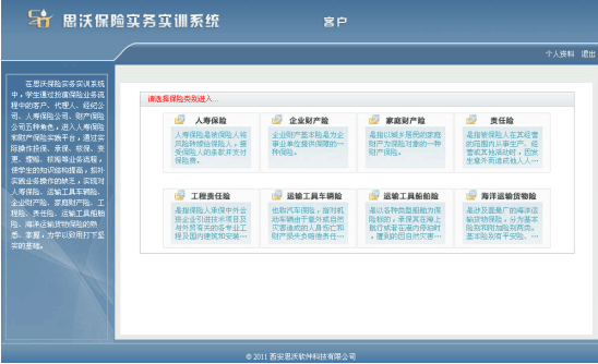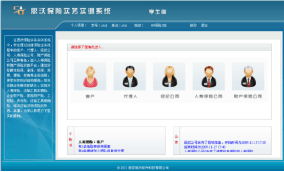 學生通過飾演保(bao)(bao)險(xian)業(ye)務(wu)(wu)流程(cheng)中的(de)(de)(de)客(ke)戶、代理人(ren)、經紀公司(si)、人(ren)壽(shou)保(bao)(bao)險(xian)公司(si)、財產(chan)(chan)保(bao)(bao)險(xian)公司(si)五種角色,進入“人(ren)壽(shou)保(bao)(bao)險(xian)”和“財產(chan)(chan)保(bao)(bao)險(xian)”實(shi)踐平臺,從展業(ye)投保(bao)(bao)環節(jie)開始,至索(suo)賠理賠為止,全(quan)面(mian)操(cao)練保(bao)(bao)險(xian)核(he)心業(ye)務(wu)(wu)中的(de)(de)(de)投保(bao)(bao)、承(cheng)保(bao)(bao)、核(he)保(bao)(bao)、變(bian)更(geng)、理賠、核(he)賠等流程(cheng),使學生的(de)(de)(de)知(zhi)識結構(gou)提升,彌補實(shi)踐業(ye)務(wu)(wu)操(cao)作的(de)(de)(de)缺乏,實(shi)現對人(ren)壽(shou)保(bao)(bao)險(xian)、運(yun)輸(shu)(shu)工具車輛險(xian)、企業(ye)財產(chan)(chan)險(xian)、家庭財產(chan)(chan)險(xian)、海洋(yang)運(yun)輸(shu)(shu)貨物保(bao)(bao)險(xian)、運(yun)輸(shu)(shu)工具船舶險(xian)、責任險(xian)、工程(cheng)險(xian)的(de)(de)(de)熟悉、掌(zhang)握(wo),對保(bao)(bao)險(xian)業(ye)務(wu)(wu)的(de)(de)(de)主要工作流程(cheng)有一個清晰的(de)(de)(de)輪(lun)廓,為學以(yi)致(zhi)用打下堅固的(de)(de)(de)基礎。