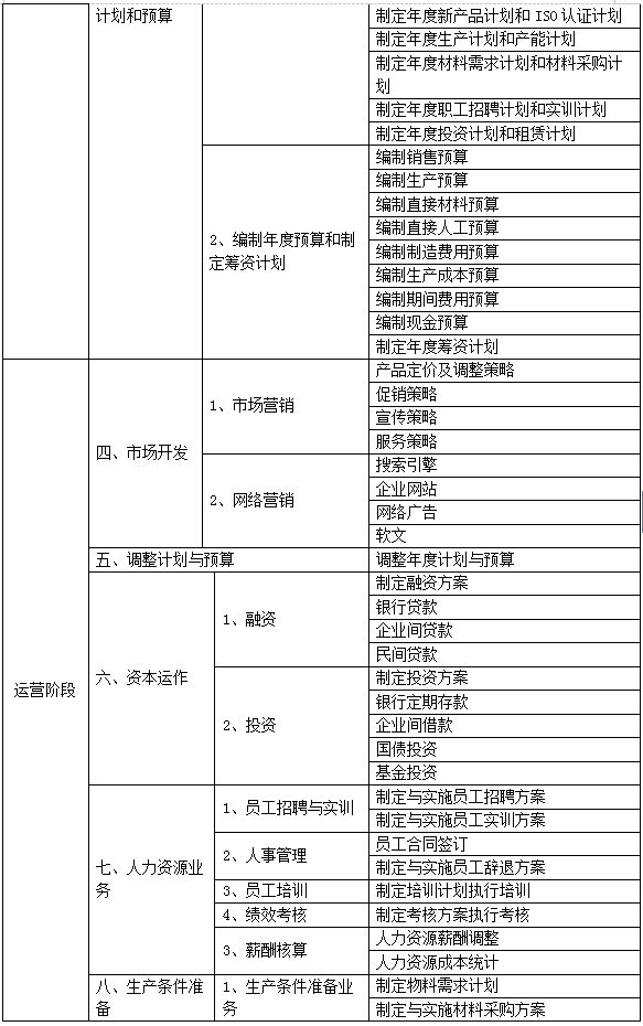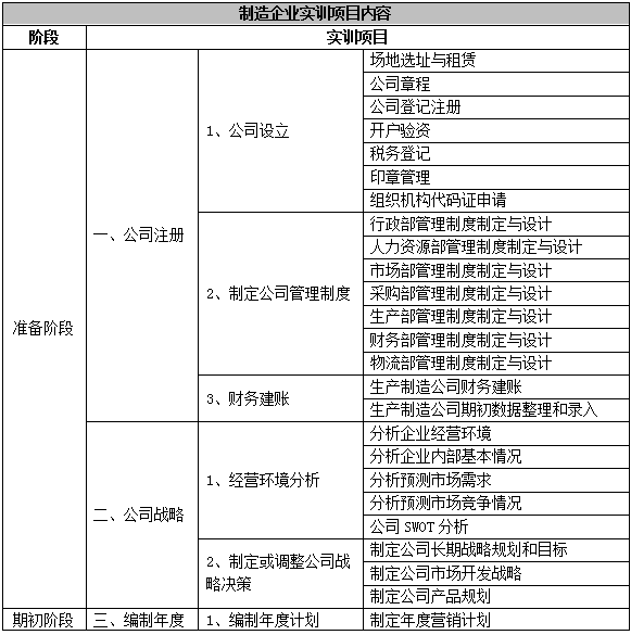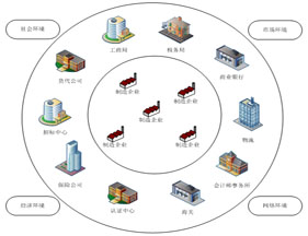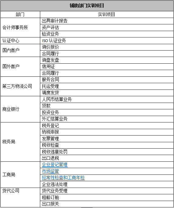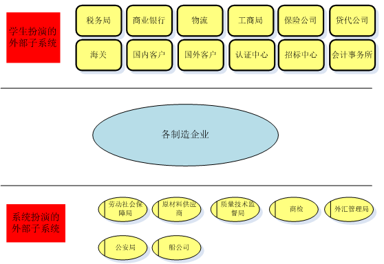 跨(kua)專業(ye)(ye)(ye)(ye)平臺主要(yao)由搭建平臺運行環境、制造(zao)企業(ye)(ye)(ye)(ye)運營、行政業(ye)(ye)(ye)(ye)務和(he)金融(rong)業(ye)(ye)(ye)(ye)務等幾(ji)大部(bu)分組成。以(yi)現代制造(zao)行業(ye)(ye)(ye)(ye)為藍本,設置總經理辦公(gong)室、銷售部(bu)、生(sheng)產部(bu)、采購部(bu)、倉(cang)儲部(bu)、外貿部(bu)、市場部(bu)、財務部(bu)、人(ren)才資(zi)源部(bu)、企業(ye)(ye)(ye)(ye)投(tou)資(zi)融(rong)部(bu)等十(shi)大制造(zao)企業(ye)(ye)(ye)(ye)職能部(bu)門;真實(shi)模擬(ni)行政辦事(shi)部(bu)門,提供(gong)工(gong)商(shang)(shang)局(ju)、稅務局(ju)、會計事(shi)務所、銀行、物流(liu)、保(bao)險公(gong)司、貸代公(gong)司等辦事(shi)場所;系統虛擬(ni)扮演公(gong)安局(ju)、質(zhi)量與技(ji)術監(jian)督局(ju)、勞動(dong)與社會保(bao)障局(ju)、原材(cai)料供(gong)應商(shang)(shang)、海(hai)關(guan)、商(shang)(shang)檢、外匯管(guan)理局(ju)、船公(gong)司等服(fu)務性部(bu)門行業(ye)(ye)(ye)(ye)。攘括了與制造(zao)行業(ye)(ye)(ye)(ye)有(you)關(guan)的所有(you)相(xiang)關(guan)行政辦事(shi)部(bu)門和(he)服(fu)務性行業(ye)(ye)(ye)(ye)。