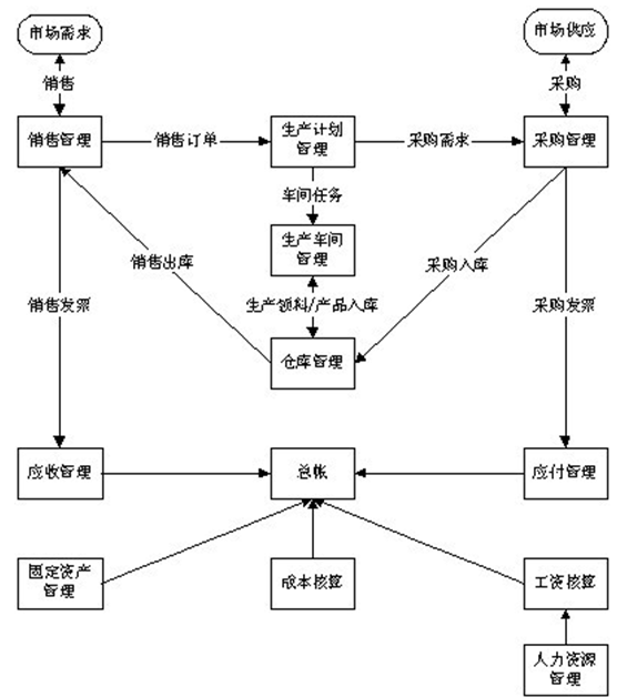 制(zhi)(zhi)造企(qi)業(ye)內(nei)部(bu)運作(zuo)是(shi)以(yi)銷售、生產(chan)、采購、財務待(dai)為主的經(jing)營(ying)模式,采用制(zhi)(zhi)造企(qi)業(ye)ERP管(guan)(guan)理(li)(li)理(li)(li)念(nian),企(qi)業(ye)的物(wu)流、資(zi)金(jin)(jin)流、和(he)信息(xi)流統一起來進行管(guan)(guan)理(li)(li),對企(qi)業(ye)所(suo)擁有(you)的人(ren)力、資(zi)金(jin)(jin)、材(cai)料、設備(bei)、方法(生產(chan)技術)、信息(xi)和(he)時間等各項資(zi)源進行綜合平衡和(he)充(chong)分考慮,最大限度的利用企(qi)業(ye)的現有(you)資(zi)源取得最大的經(jing)濟效益,科學(xue)、有(you)效的管(guan)(guan)理(li)(li)企(qi)業(ye)人(ren)、財、物(wu)、產(chan)、供、銷等各項具體業(ye)務工(gong)作(zuo)。包含如MRP、MTO、MTP、JIT等的應用。如下流程: